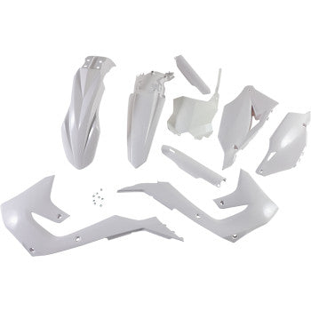- Full kit includes front fender, front number plate, lower fork cover set, radiator shrouds, side panels, and rear fender